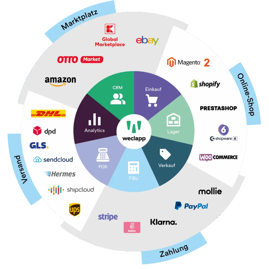 weclapp lässt sich nahtlos mit vielen Systemen verbinden – von Shops wie Shopware oder Shopify über Marktplätze wie Amazon und eBay bis hin zu Versanddienstleistern und Zahlungsanbietern.